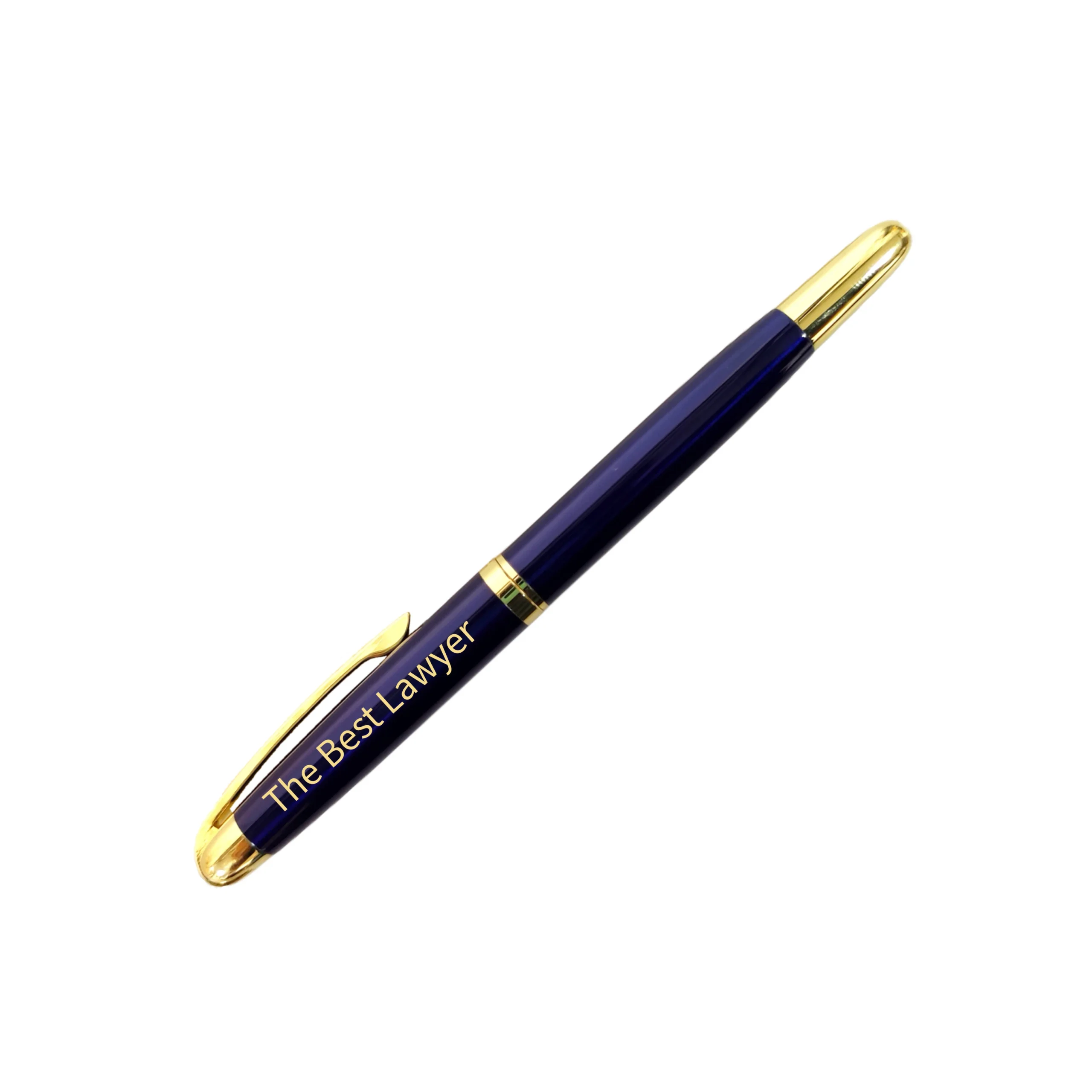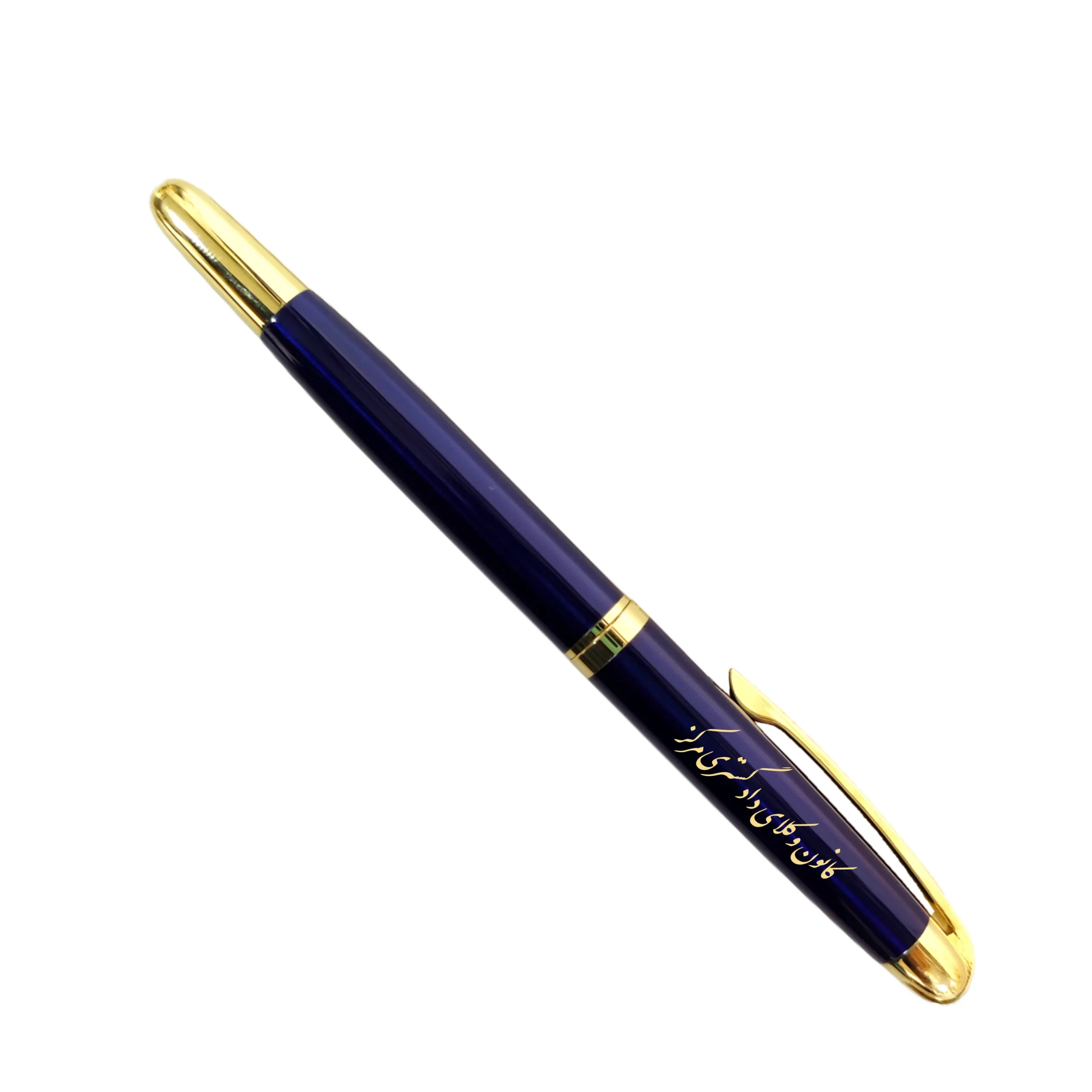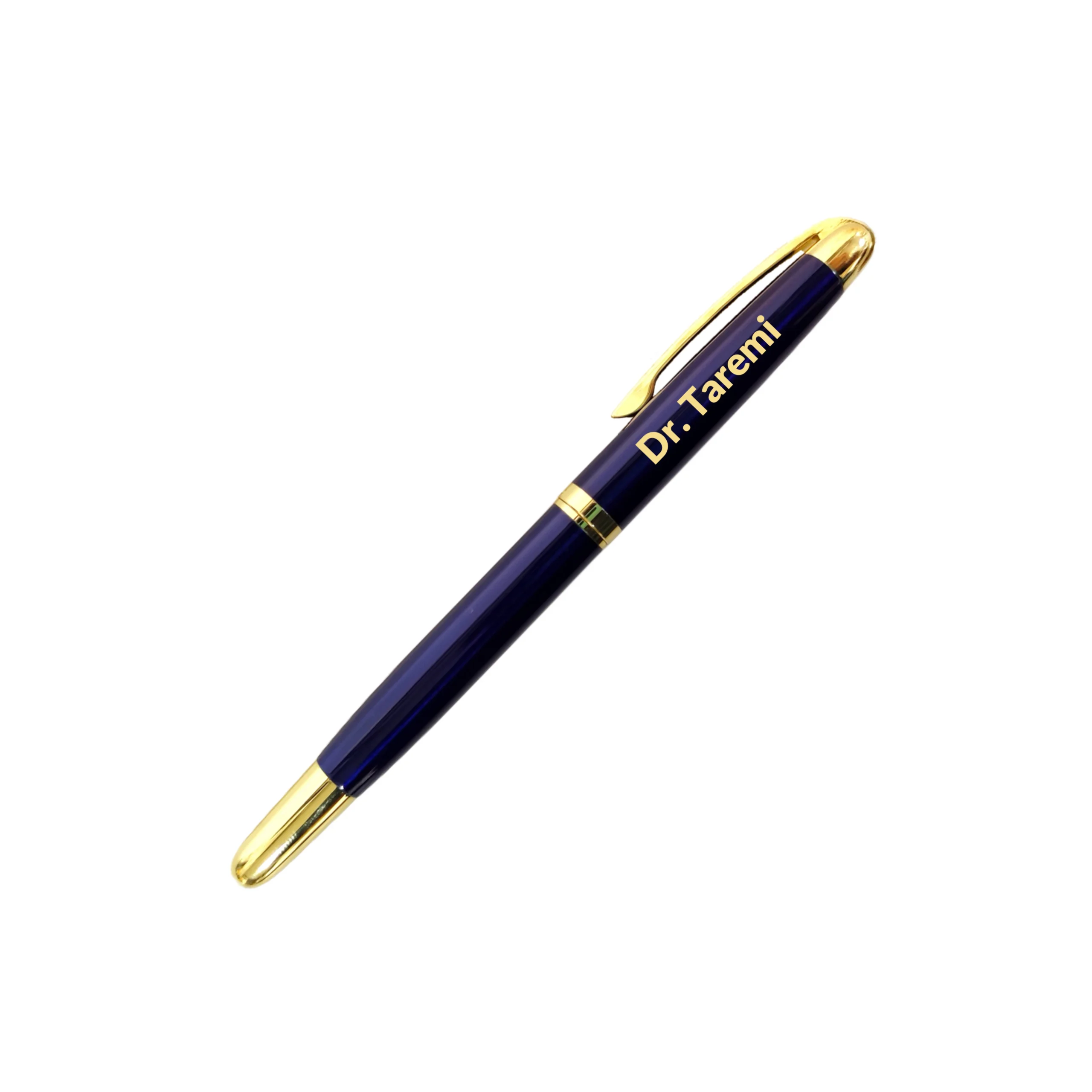 - متن حک شده روی آن به رنگ طلایی میشود که با رنگ وسط قلم، گیره روی درب و انتهای قلم ست هماهنگ و زیبایی ارائه میکند
